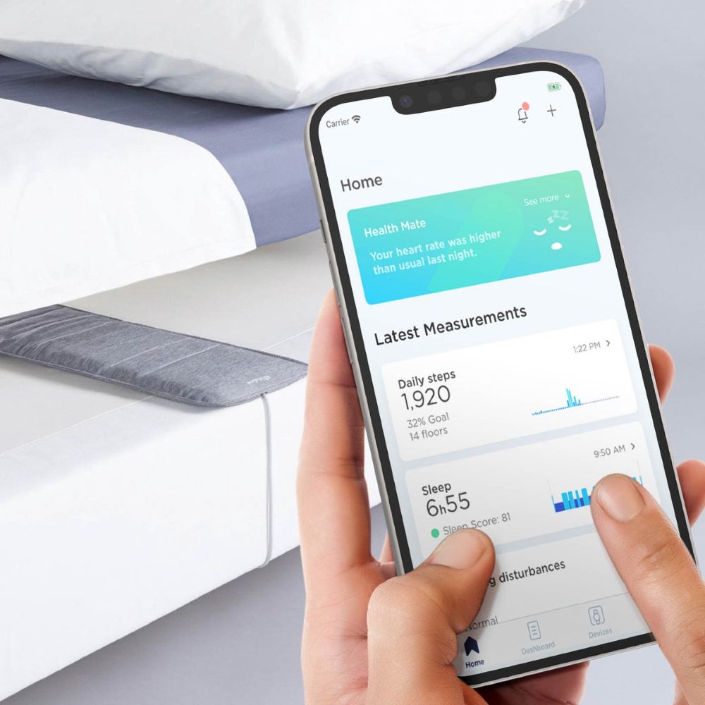 De Withings Sleep Analyzer helpt je om je slaap beter te begrijpen en te verbeteren. Deze slimme slaaptracker plaats je eenvoudig onder je matras. Je hoeft geen horloge of band te dragen, want de metingen gebeuren volledig automatisch terwijl je slaapt.